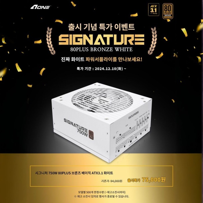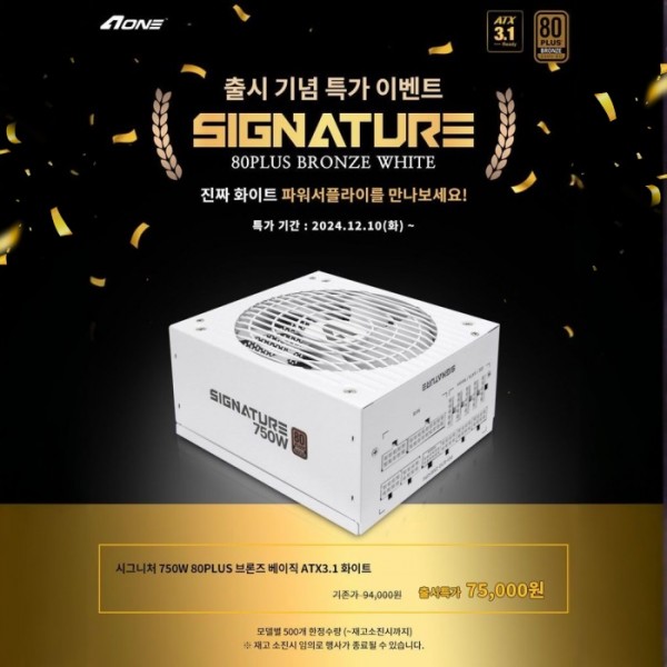 에이원아이엔티, 에이원, aoneint, aone, 차세대, ATX 3.1 규격, 파워서플라이, 시그니처, 750W 80PLUS 브론즈 화이트, 출시, 특가판매, 진행