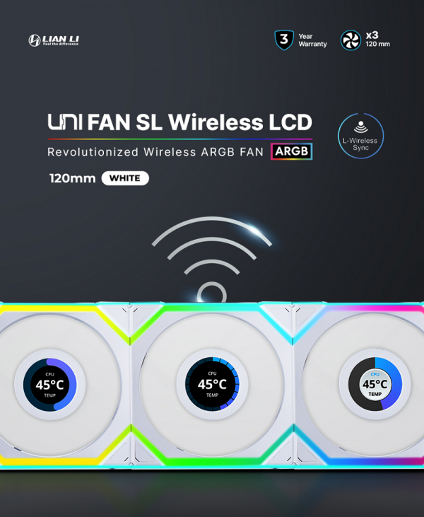 리안리 유니팬 SL 와이어레스 LCD 120은 팬 중앙부에 1.6인치 규격의 디스플레이를 내장하고 있다. 이 디스플레이는 빛 반사가 적고 색 재현력이 뛰어난 IPS 패널을 적용하여 500니트(Nits)의 밝기와 24비트의 풀 컬러를 지원한다. 해상도는 가로, 세로 400 픽셀로 되어 있어 각 부품의 온도, 사용량, RPM과 같은 다양한 시스템 정보는 물론, 커스터마이징이 가능한 이미지나 영상 등을 재생할 수 있다.