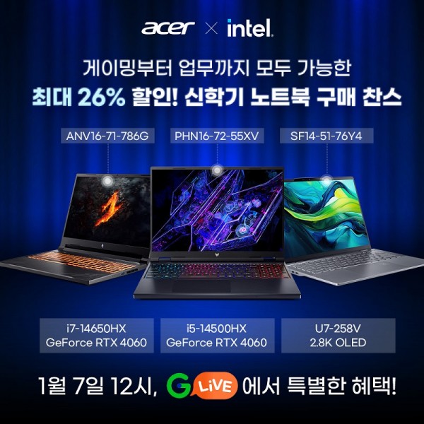 글로벌 PC제조사 에이서(Acer)가 2025년 1월 7일 낮 12시부터 1시간 동안 G마켓 라이브 방송인 G라이브를 통해 자사 노트북을 최대 29% 할인된 가격에 판매한다고 밝혔다.
