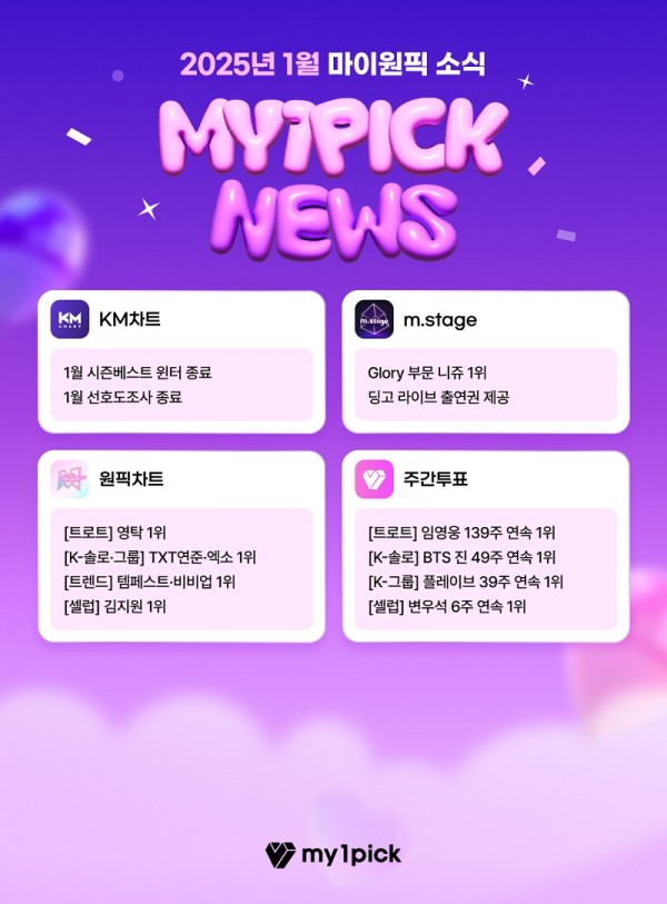 마이원픽은 주간 투표를 통해 각 부문별 Top 10을 선정하고, 이를 기반으로 월간 차트인 원픽차트 투표를 진행하고 있다. 특히 분기별 트로피를 시상하는 원픽차트 4th Season 결과가 공개되며, 각 부문별 1위 아티스트가 확정됐다. 이번 시즌차트에서 △트로트 부문 영탁 △K-솔로 부문 TXT 연준 △K-그룹 부문 엑소 △트렌드 부문 템페스트·비비업 △셀럽 부문 김지원이 각각 1위를 차지하며 팬들의 뜨거운 지지를 입증했다. 시즌차트 1위를 기록한 아티스트에게는 마이원픽 시즌차트 트로피가 수여되며, 언론사 보도자료 배포, 마이원픽 공식 SNS 홍보 리워드 등의 혜택이 제공된다.