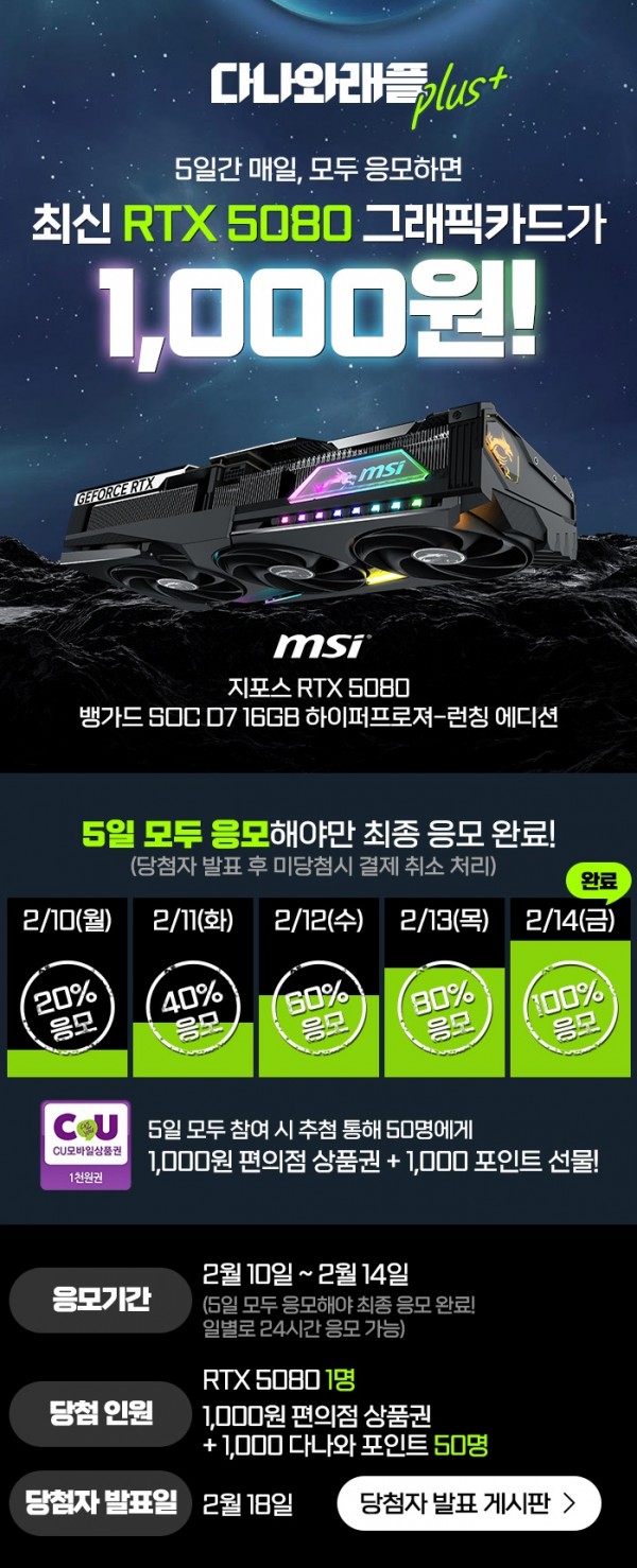 이벤트는 국내 대표 가격 비교 서비스 플랫폼인 다나와에서 진행하며, 2월 10일 ~ 2월 14일까지 5일간 매일 응모하여 래플 이벤트에 참여가 가능하다. 당첨자 발표는 2월 18일 다나와 당첨자 발표 게시판에서 확인 가능하며, 추가 50명을 추첨하여 1,000원 편의점 상품권 + 1,000원 다나와 포인트를 증정한다. 그래픽카드 당첨자의 응모 건 1건을 제외한 모든 미 당첨 응모 건은 영업일 5일 이내에 모두 결제 취소 처리된다.
