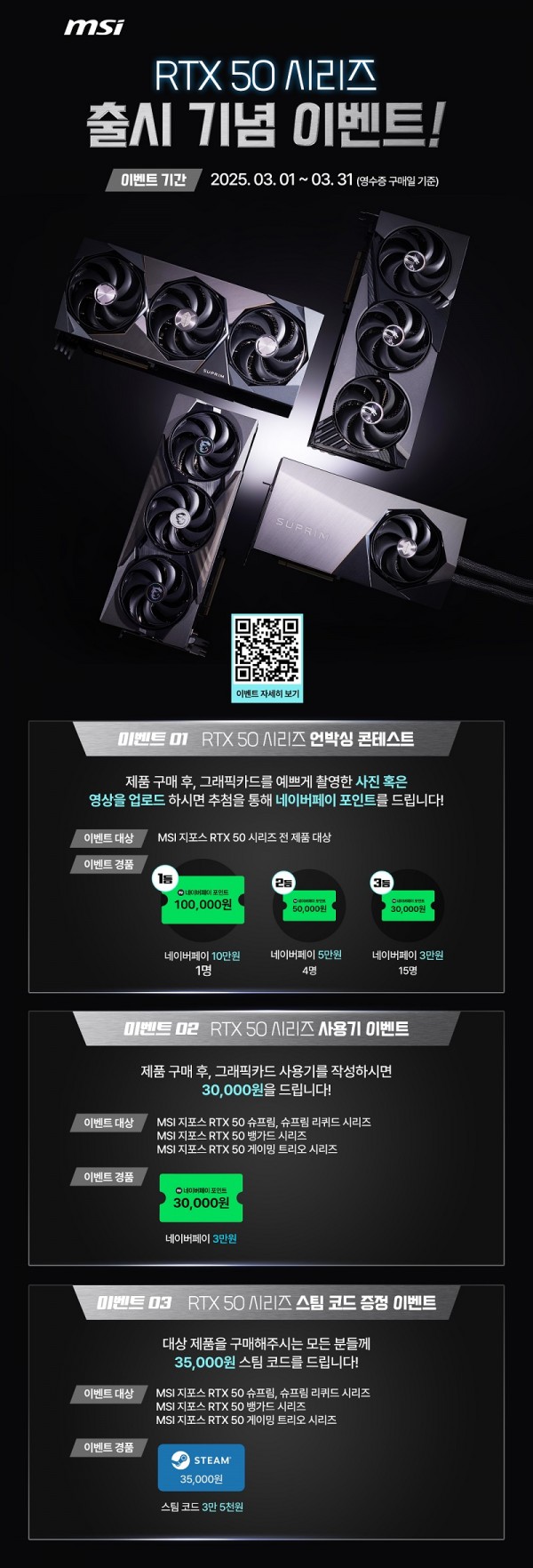 이번 행사는 2025년 3월 1일부터 3월 31일까지 이벤트 대상 그래픽카드를 구매한 고객을 대상으로 진행되며, 구매한 MSI 지포스 RTX™ 50 시리즈의 예쁜 사진 및 영상을 자랑하는 언박싱 콘테스트와 사용기 이벤트, 그리고 35,000원 스팀 월렛 증정 이벤트까지, 총 세 가지 이벤트가 진행된다. 이벤트 대상 제품 및 자세한 내용은 MSI 사용자 카페(https://cafe.naver.com/msicom/242077)에서 확인할 수 있다.
