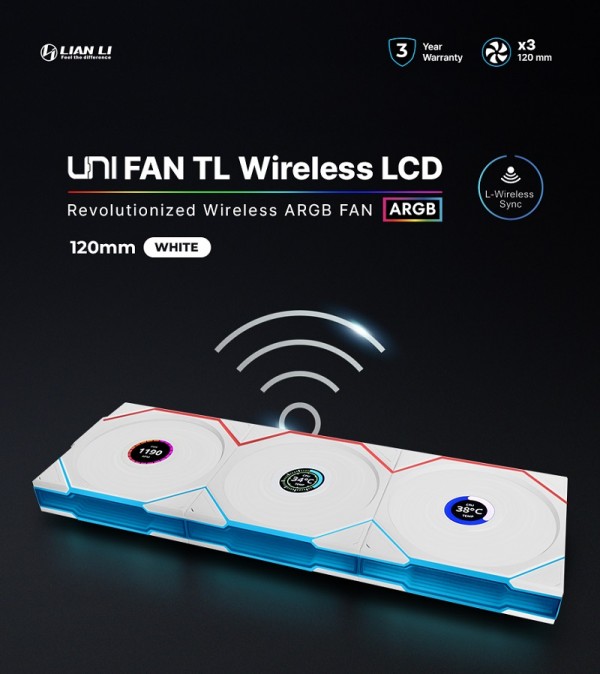리안리 유니팬 TL 와이어레스 LCD 120은 앞서 출시된 동명 모델을 베이스로 팬 중앙부에 1.6인치 크기의 LCD 디스플레이가 추가된 모델이다. 제품 규격은 120mm로 제품명과 동일하며, 측면부 인피니티 미러(Infinity Mirror)를 이용한 RGB LED 영역도 일반 TL 와이어레스 모델과 같다. 제품은 블랙과 화이트로 나뉘어진 색상 구분과 1개, 3개씩 포함된 패키지 구분에 따른 1팩(PACK), 3팩 제품으로 나뉘어진 총 4종이 준비되어 있으며, 3팩 제품에만 전용 USB 무선 신호 송수기인 ‘L-Wireless’가 동봉된다.