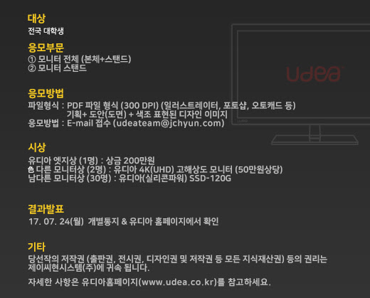 2017 전국대학생 대상 유디아 모니터 디자인 공모전 응모기간은 6월 12일부터 7월 15일까지 이며, 응모부문은 모니터 전체 디자인 또는 스탠드부분으로 정했다. 본인이 만들고 싶은, 쓰고 싶은 모니터 디자인을 자유로운 형태로 표현하여 규격에 맞게 온라인상 (E-mail접수) 제출하면 된다.