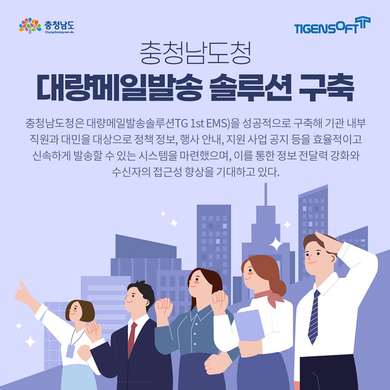 대량메일발송 솔루션 및 통합메시징 솔루션, 설문조사 솔루션 개발/판매 전문기업 티젠소프트(대표 고훈호)가 충청남도청 대량메일발송솔루션(TG 1st EMS)을 성공적으로 구축했다고 밝혔다.