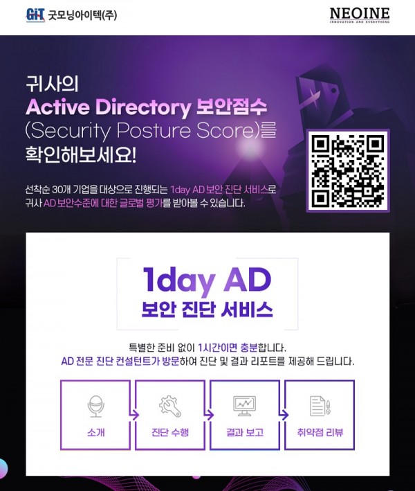 굿모닝아이텍(대표 이주찬)이 AD 보안 전문기업 네오아이앤이와 함께 ‘원데이 AD 진단 서비스’를 제공한다고 밝혔다.
