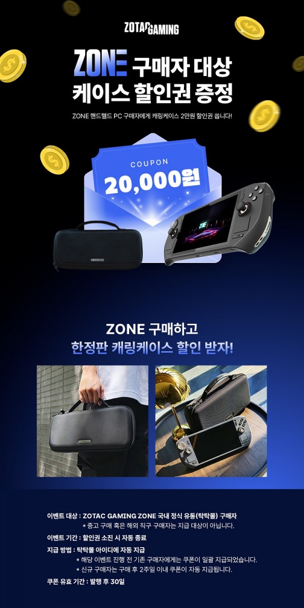 조텍코리아(ZOTAC Korea, 대표이사 김성표, www.zotackor.com)는 자사의 프리미엄 게이밍 핸드헬드 PC인 ‘ZOTAC GAMING ZONE’과 호환하여 사용할 수 있는 프리미엄 캐링 케이스 할인 쿠폰을 발행한다.