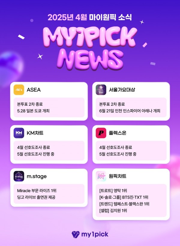IT | 마이원픽 4월 결산, ASEA·서울가요대상 등 글로벌 시상식 투표 열기 이어져