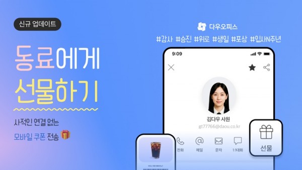 이번에 도입된 선물하기 기능은 다우오피스 사용자들이 조직 내 주요 기념일이나 축하, 감사의 마음을 다양한 형태의 모바일 쿠폰으로 손쉽게 전달할 수 있도록 기획된 서비스다. 식음료, 상품권, 편의점 교환권, 문화 콘텐츠 이용권 등 3000여 종의 상품이 제공된다.