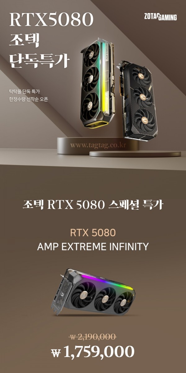 본 특가 이벤트는 조텍 공식 쇼핑몰 탁탁몰(www.tagtag.co.kr)에서 6월 9일 오후 4시부터 단독 진행된다. 한정 수량 대상으로 ‘ZOTAC GMAING GeForce RTX 5080 AMP Extreme Infinity’를 1,759,000원에 만나볼 수 있으며, 다나와 최저가 기준 약 30만원 저렴하게 구매할 수 있는 기회이다. 본 특가 이벤트는 6월 9일부터 수량 소진 시까지 진행된다.