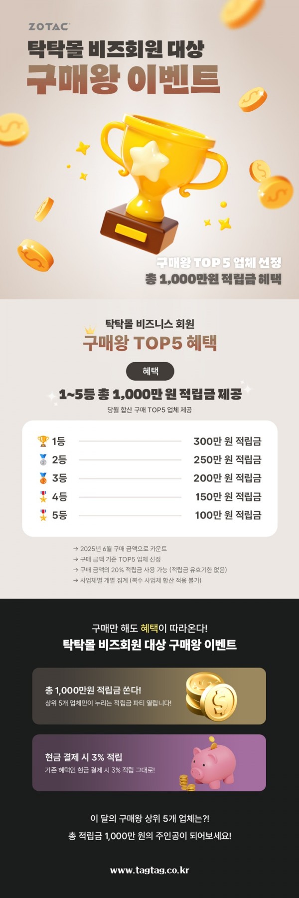 본 이벤트는 조텍코리아 공식몰 탁탁몰(www.tagtag.co.kr) 내 비즈 회원으로 등록된 회원 대상으로 진행된다. 2025년 6월 1달 동안 탁탁몰에서 가장 많은 금액을 결제한 사업체 Top 5를 선정해, 1등부터 5등까지 각각 300만원, 250만원, 200만원, 150만원, 100만원의 적립금을 제공해 총 1000만원의 적립금 혜택을 받을 수 있는 이벤트이다.