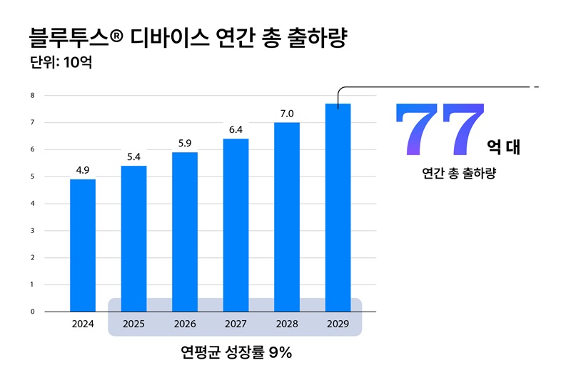 2025년 블루투스 디바이스 출하량은 53억 대를 넘어설 것으로 예상되며, 2029년에는 약 80억 대에 달할 전망이다.