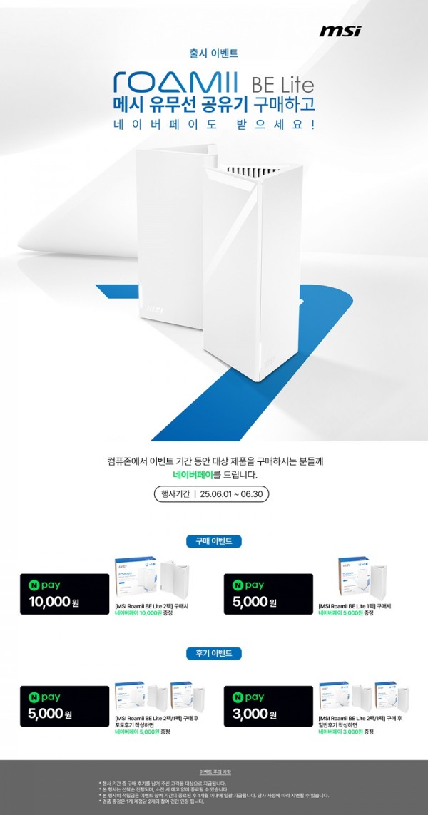 이번 행사는 2025년 6월 1일부터 6월 30일까지 컴퓨존에서 MSI Roamii BE Lite 메시 시스템을 구매한 고객을 대상으로 선착순으로 진행되며, 소진 시 예고 없이 종료될 수 있다.