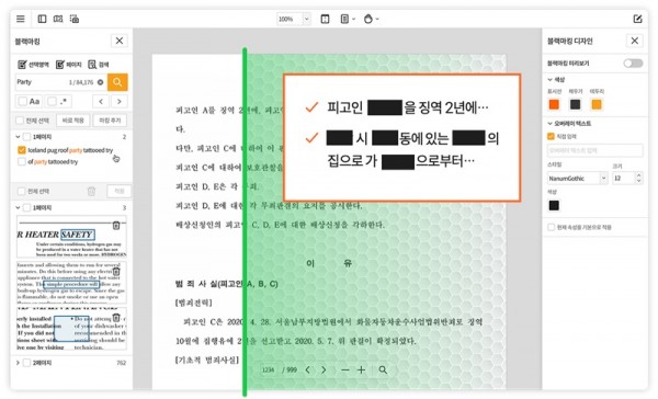 이파피루스 자체 개발 모듈인 ‘블랙마커’는 PDF 문서에 포함된 민감정보를 찾아내고 마스킹(Masking) 처리한 후 원본 데이터를 삭제해 정보 유출 위험을 원천 차단한다. 이번 업그레이드를 통해 기존의 전화번호, 주민등록번호, 이메일과 같이 일정한 형식을 갖춘 정형화된 데이터는 물론 인명이나 주소와 같은 비정형 개인정보도 자동으로 감지해 일괄 비식별 처리할 수 있게 됐다.
