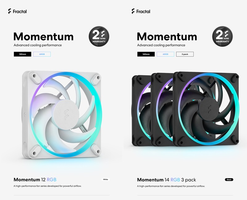프렉탈디자인 모멘텀 시리즈는 동사의 PC케이스, 메쉬파이(Meshify) 3 출시에 맞춰 함께 준비된 신제품 쿨링팬이다. 앞서 출시된 일반 모델에 이어 새롭게 출시된 이번 제품은 ARGB를 지원하는 모델로서 제품명 뒤에 ‘RGB’가 표기된다.