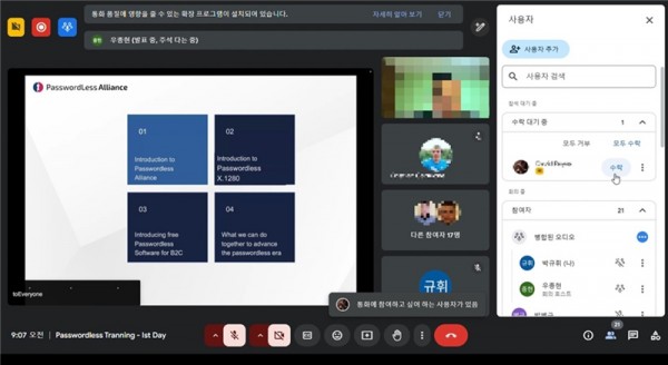 이번 교육은 패스워드리스 얼라이언스 포럼이 수행한 첫 해외 기술 이전 프로그램으로, △X.1280 표준에 대한 이해 △Passwordless X1280 무료 소프트웨어의 설치 및 구성 △주요 이슈 진단 및 해결 전략 등을 중심으로 3일간 원격 화상 방식으로 진행됐다. 에콰도르의 사이버 보안 전문가 20명이 교육에 참여했으며, 패스워드리스 얼라이언스의 테크 멤버인 듀얼오스가 강의를 맡아 교육을 지원했다.