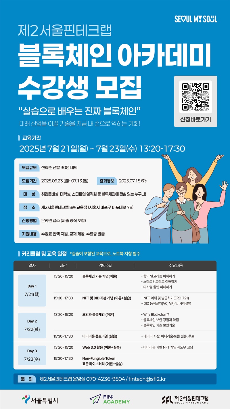 블록체인 아카데미는 일반 시민들의 디지털 역량 함양을 목적으로 제2서울핀테크랩이 2023년 개소 이후 매년 운영하고 있는 시민 참여형 교육프로그램이다. 대학생, 취업 준비생, 스타트업 임직원 등 블록체인에 관심이 있는 누구나 신청할 수 있다. 모집 규모는 30명으로, 교육생에게는 강의 자료 제공과 함께 수료증도 발급된다.
