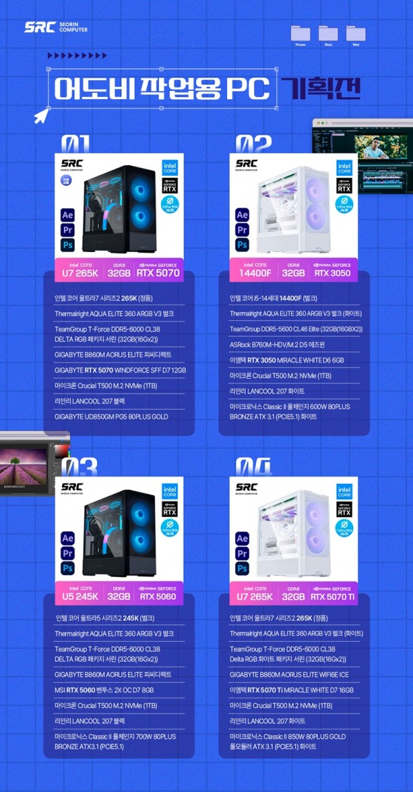 서린컴퓨터 어도비 작업용 PC 기획전 상위 모델에는 인텔 코어 울트라7 265K 프로세서와 RTX 5070 또는 5070 Ti 그래픽카드가 탑재되어 프리미어 프로, 애프터 이펙트, 라이트룸과 같은 고해상도 영상 및 이미지 작업에 적합하다. 중간급 구성에는 울트라5 245K와 RTX 5060, 엔트리급 모델에는 14세대 i5 14400F와 RTX 3050이 적용되어 기본적인 영상 편집 및 포토샵 작업에 최적화되어 있다.