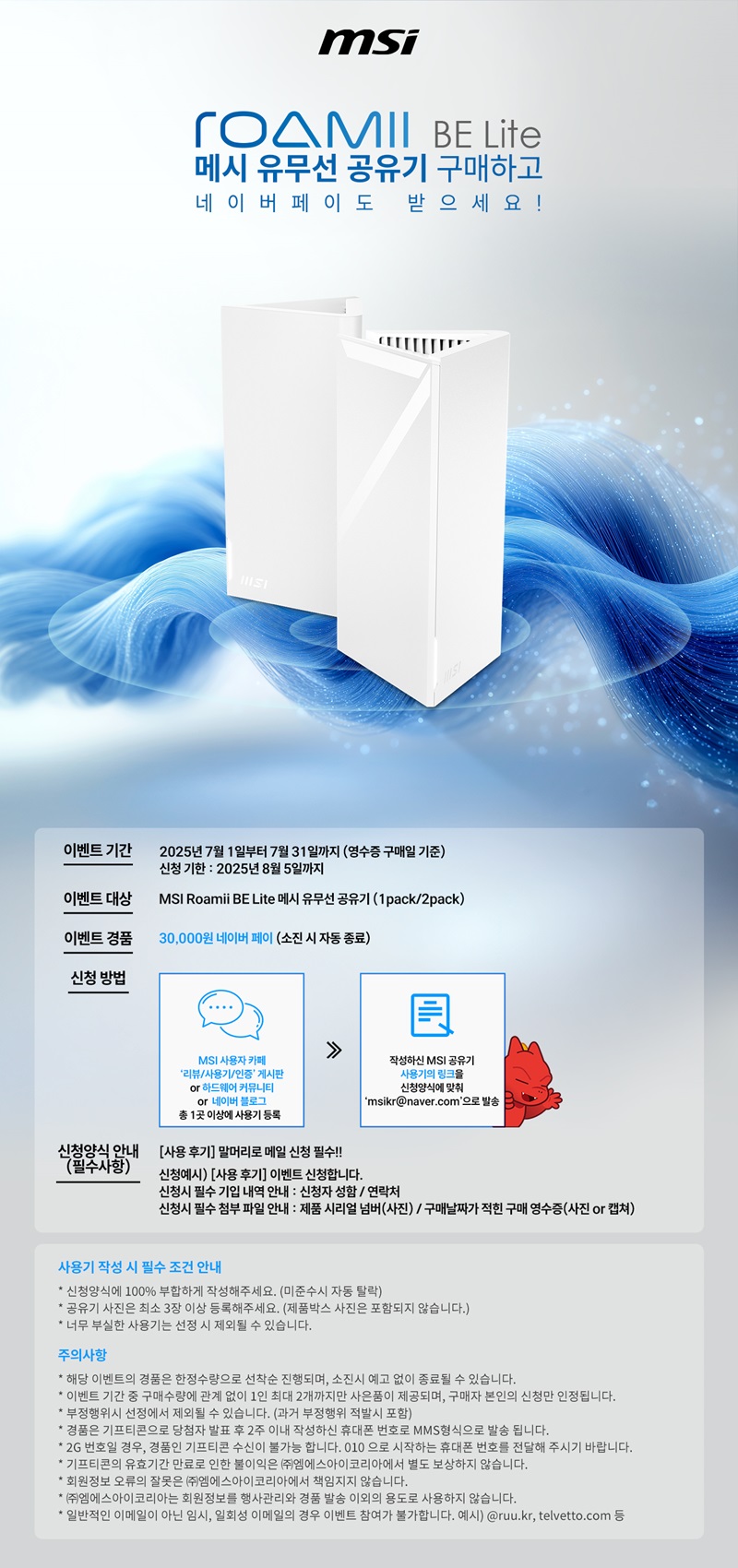 이번 행사는 2025년 7월 1일부터 7월 31일까지 MSI Roamii BE Lite 메시 유무선 공유기를 구매하고 사용기를 작성한 고객을 대상으로 진행된다. 기간 내 구매자들은 2025년 8월 5일까지 이벤트를 신청할 수 있다.