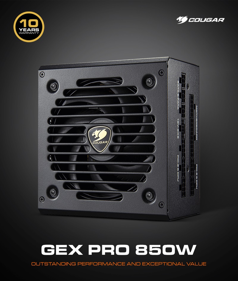 쿠거 GEX 프로 850은 최신 ATX 3.1과 PCIe 5.1 규격을 지원하는 850W의 출력 용량을 지원하는 고성능 파워서플라이 제품이다. 모든 출력 구간에서 87% 이상의 전력 변환 효율을 지원해 파워서플라이의 성능 척도라 불리는 80플러스(PLUS)와 CYBENETICS에서 골드(GOLD) 등급을 받았으며, 작동 소음을 기준으로 하는 LAMBDA 테스트에서도 두번째로 높은 등급인 A+ 인증을 획득해 높은 효율성과 정숙성을 동시에 보장한다.