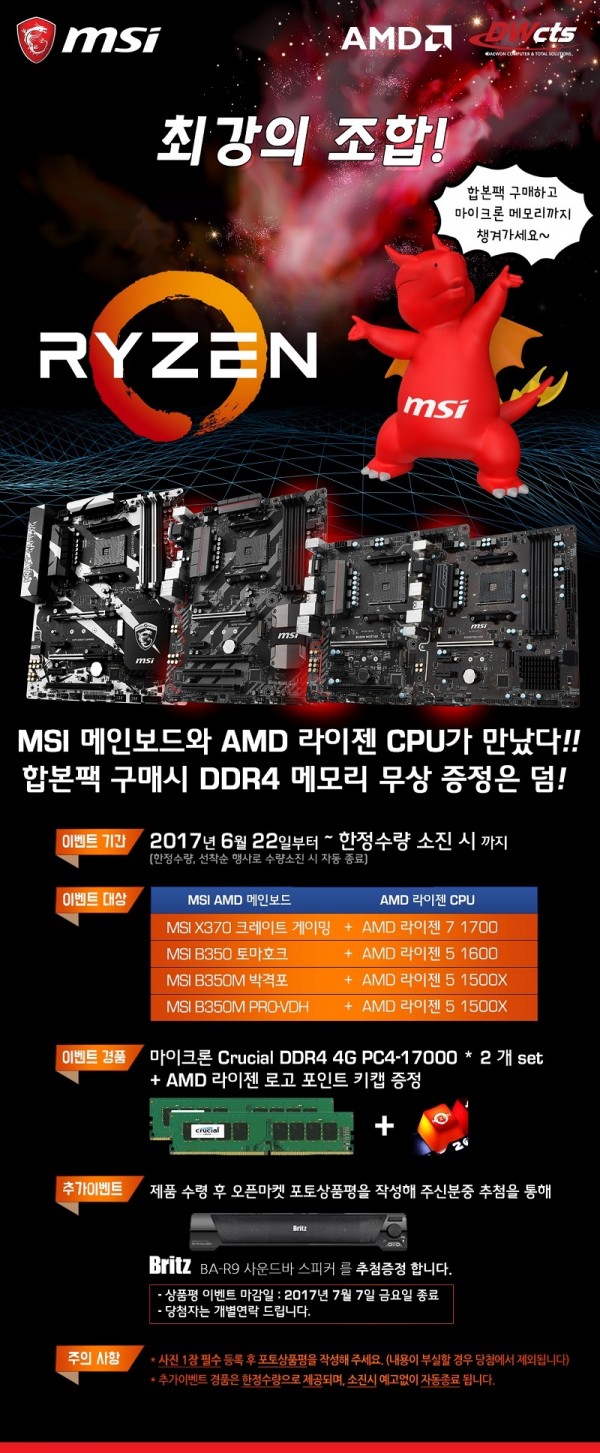 오픈마켓 11번가, 옥션, G마켓을 통해 2017년 6월 22일(목)부터 한정 수량 소진 시까지 진행되는 이번 이벤트는 MSI 메인보드와 AMD 라이젠 CPU 합본팩을 구매한 고객을 대상으로 한다. 경품은 ‘마이크론 Crucial DDR4 4G PC4-17000 메모리 2개’, ‘AMD 라이젠 로고 포인트 키캡’으로 100% 1:1로 증정되며 제품 수령 후 오픈마켓 포토상품평을 작성하면 Britz BA-R9 사운드바 스피커를 추첨을 통해 추가 증정한다.