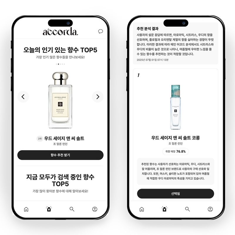어코다의 추천은 단순한 상품 제안이 아니다. 사용자가 좋아할 만한 향수를 제시하는 동시에, 그 이유까지 함께 알려준다. 예를 들어 머스크 계열 향수를 보유한 사용자는 비슷한 계열의 새로운 향수를 추천받고, 어떤 점이 비슷한지 설명까지 받을 수 있다. 기존의 향수 플랫폼이 단순한 정보 나열에 그쳤다면, 어코다는 사용자의 취향에 집중한다. 마치 향수를 잘 아는 친구가 내 취향을 이해하고 함께 시향하며 골라주는 듯한 경험을 제공해, 더욱 정교한 맞춤형 큐레이션을 완성했다.