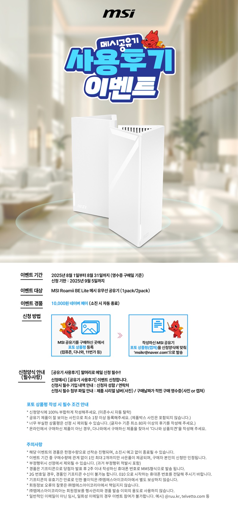 (주)엠에스아이코리아, 엠에스아이, MSI, MSI Korea, 사용 후기, 작성 시, 1만원, 증정, MSI Roamii BE Lite, 공유기, 이벤트, 진행
