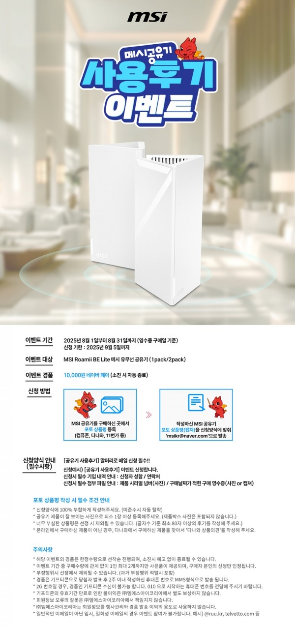 이번 행사는 2025년 8월 1일부터 8월 31일까지 MSI Roamii BE Lite 메시 유무선 공유기를 구매하고 사용 후기를 작성한 고객을 대상으로 진행된다. 기간 내 구매자들은 2025년 9월 5일까지 이벤트를 신청할 수 있다.
