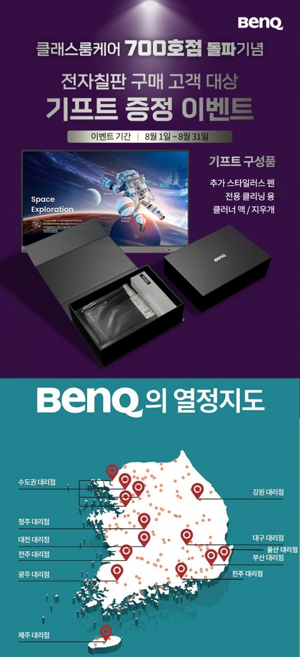 700호점 달성을 기념해, 벤큐코리아는 8월 1일부터 8월 31일까지 전자칠판 구매 고객 전원에게 추가 스타일러스 펜, 지우개, 디스플레이 클리너, 클리닝 융으로 구성된 기프트박스를 증정하는 프로모션을 진행한다.