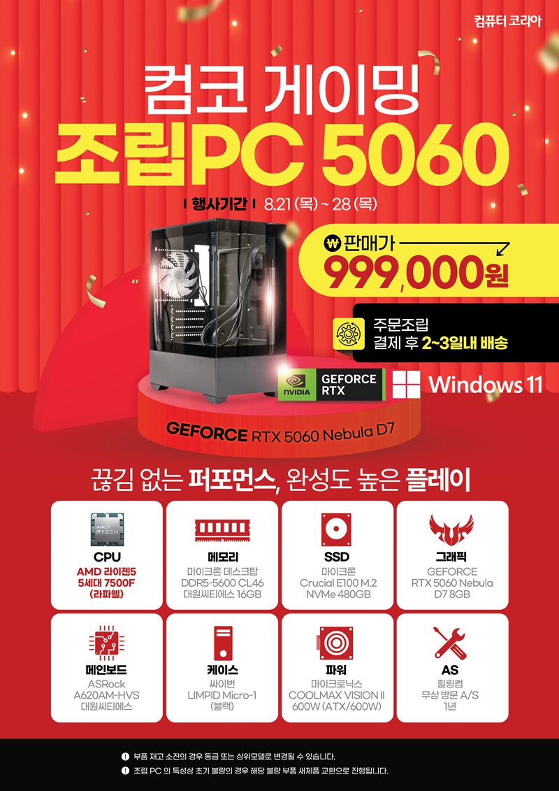 행사 대표 제품은 AMD 라이젠 5 7500F 프로세서, DDR5 16GB 메모리, 480GB SSD, 그리고 NVIDIA GeForce RTX 5060 그래픽카드를 탑재했다. 영상 편집, 고사양 게임, 스트리밍 등 다양한 작업에 최적화된 구성으로 전문가뿐 아니라 일반 소비자에게도 적합하다.
