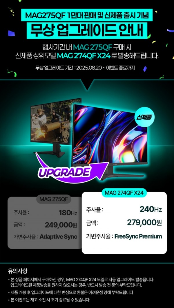 MAG 274QF 시리즈는 일반형 274QF와 X24 버전(274QF X24) 두 가지로 출시되며, 이 중 일반형 274QF는 180Hz의 높은 주사율을 지원하면서도 X24 버전에 비해 더욱 합리적인 가격을 갖춘 것이 특징이다. 그러나 8월 20일부터 컴퓨존 진행되는 프로모션을 통해 해당 제품을 구매하면, 기존 180Hz 대비 한층 향상된 240Hz 초고주사율과 AMD FreeSync™ Premium 기능을 지원하는 X24 모델로 무상 업그레이드를 받아볼 수 있다.