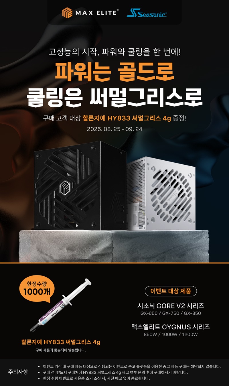 이번 행사는 2025년 8월 25일부터 2025년 9월 24일까지 시소닉 CORE V2 시리즈 (GX-650, GX-750, GX-850) 및 맥스엘리트 STARS CYGNUS 시리즈 (850W, 1000W, 1200W) 파워서플라이를 구매하시는 모든 고객들을 대상으로 진행된다. 이벤트 기간 내 구매 고객에게는 쿨링을 돕는 고성능 써멀그리스 ‘할른지예 HY833 써멀그리스(4g)가 한정 수량 1,000개에 한해 증정된다.