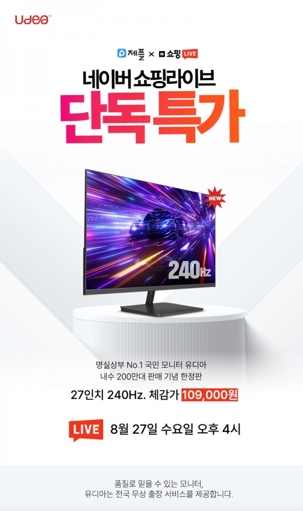 디스플레이 | 제이씨현, UDEA 누적 200만대 판매 기념 27형 240Hz 모니터 일반모니터 가격에 네이버 쇼핑라이브 최대 21% 할인 방송 진행