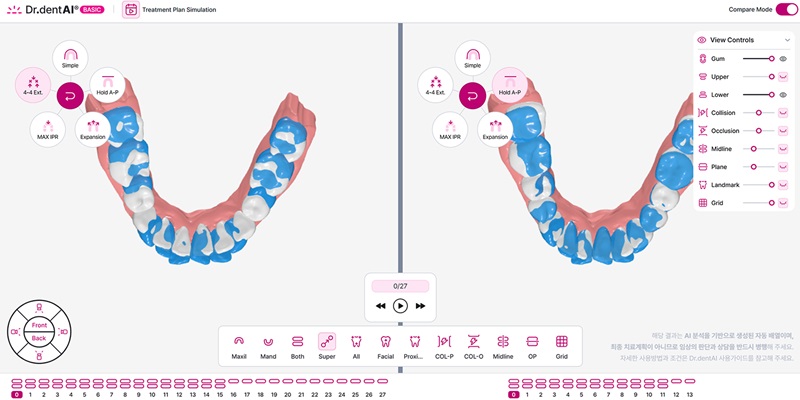 이노디테크가 이번에 선보인 닥터덴트AI 시뮬레이션 서비스는 환자의 구강 3D 스캔 데이터(STL 파일)를 자동 분석해 3분 이내에 △자동 치아 객체 분리 △부정교합 진단 △전체 치아 배열(심플), 앞니 유지(홀드AP) 치아 확장(익스팬드), 공간 확보(IPR), 발치 후 교정(44발치) 등 5가지 맞춤형 교정 전략 시뮬레이션 등의 시각화 데이터를 제공한다.