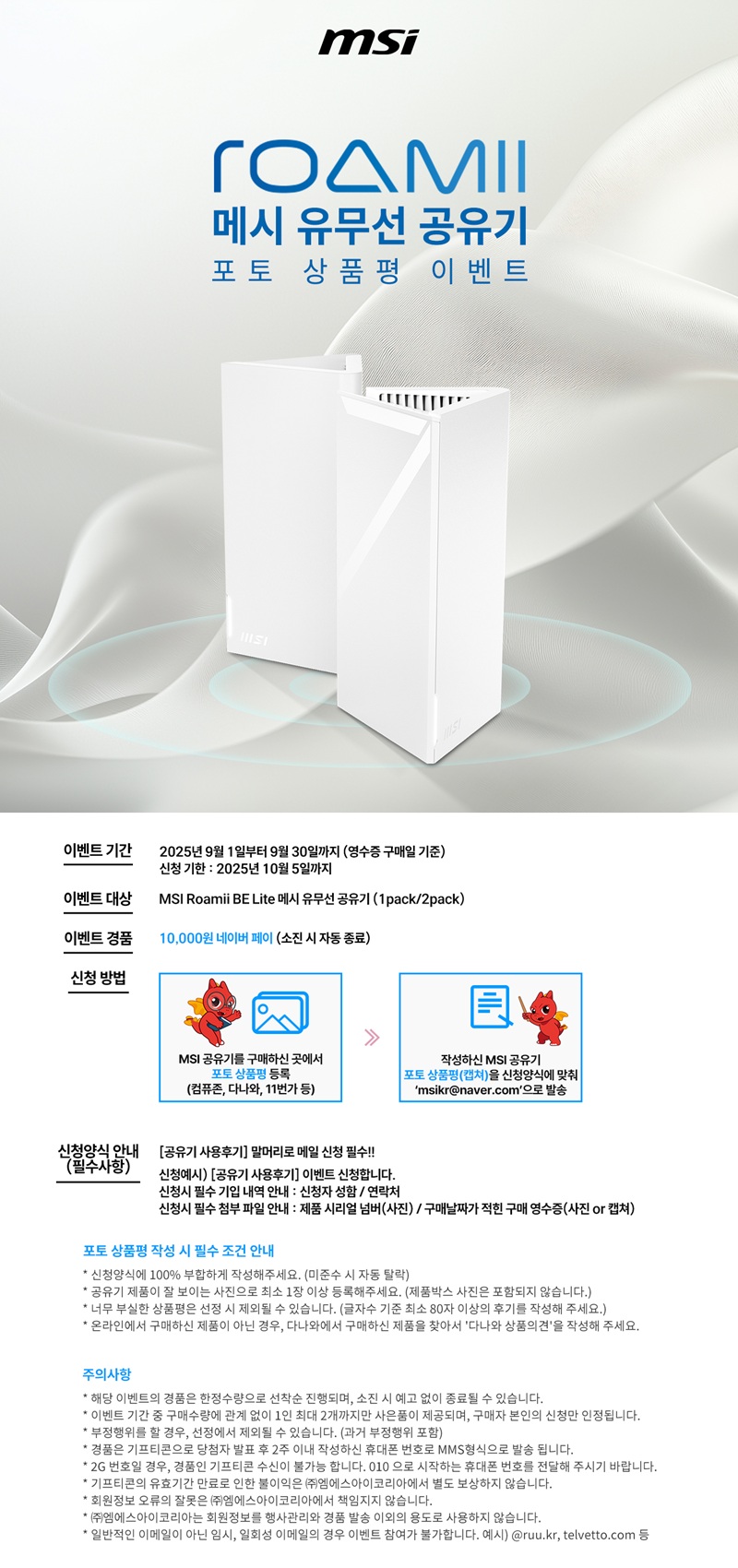 MSI Roamii BE Lite 메시 유무선 공유기를 2025년 9월 1일부터 9월 30일까지 구매하고 사용 후기를 작성한 고객이라면 누구나 참여 가능하다. 기간 내 구매자들은 2025년 10월 5일까지 이벤트를 신청할 수 있다.