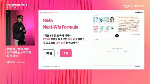 이번 행사는 아마존 미국, 일본, 호주, 남미 등 글로벌 뷰티 부문 주요 임원들이 직접 한국을 찾아 K-뷰티 브랜드들의 글로벌 확장을 지원하는 전략을 공유한 자리로, 오프라인 1000명과 온라인 5000명 이상이 참가 신청을 하며 역대 최대 규모로 진행됐다. 트렌디어 AI는 유일한 AI 기술 파트너 연사로 초청돼 업계의 큰 주목을 받았다.