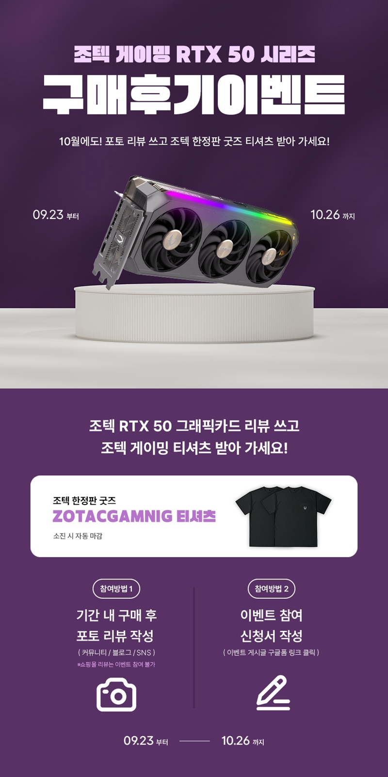 ZOTAC GAMING GeForce RTX 50 시리즈 구매자 대상 후기 국내 정상 유통된 ZOTAC GAMING GeForce RTX 50 시리즈 그래픽카드 구매자 대상으로 진행되며, 제품 사진과 간단 후기를 커뮤니티, 블로그, SNS 등에 리뷰로 적어준 분들에 한 해 제공된다. 경품으로는 ZOTAC GAMING 티셔츠가 증정되며, 2XL 사이즈로만 제공된다.