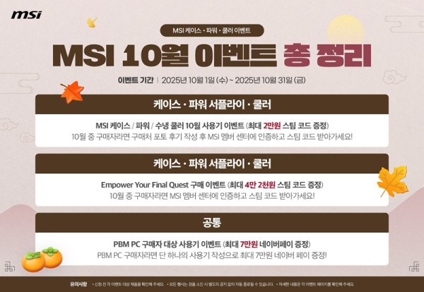 PC | MSI, 10월 PC 부품 구매자 대상 다양한 구매·사용기 이벤트로 풍성한 혜택 제공
