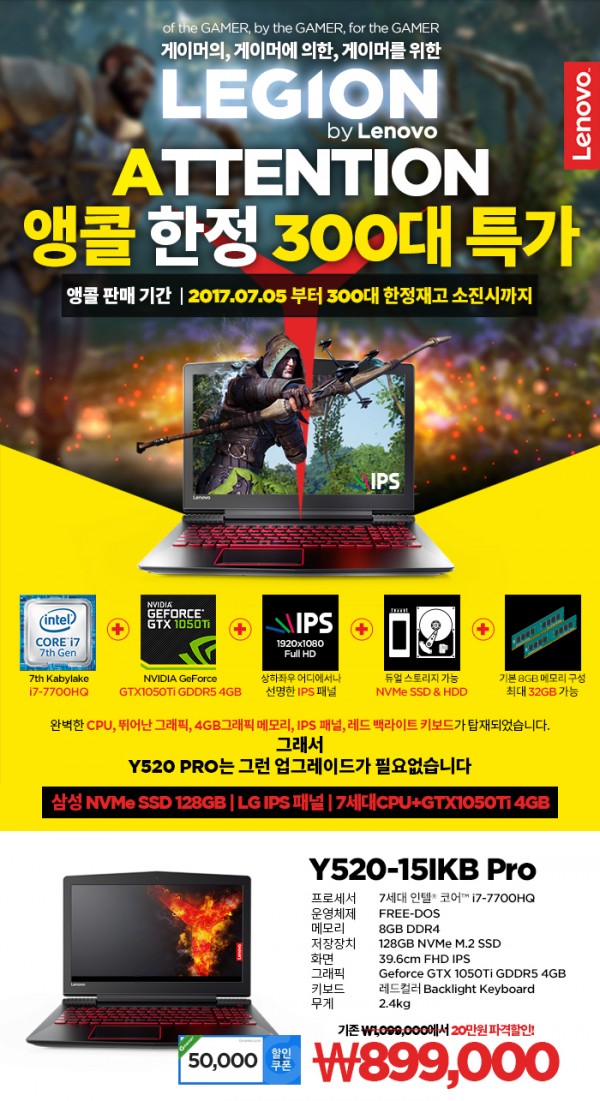 7월 5일부터 300대 한정으로 진행하는 이번 Y520 특가 프로모션에 해당되는 제품은 Y520-15IKB Pro(80WKOOLEKR)에 한정되며 옥션과 G마켓에서만 진행한다. 구매 고객에게는 최대 5만원 중복 할인 쿠폰을 제공하여 최대 적용 시 89만9000원에 구매할 수 있다.