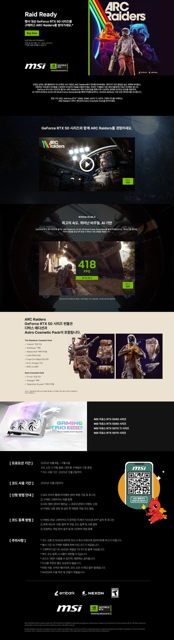 (주)엠에스아이코리아, 엠에스아이, MSI, MSI Korea, 지포스 RTX 50 시리즈, 구매자, 아크 레이더스, 게임 코드, 증정, 이벤트, 진행