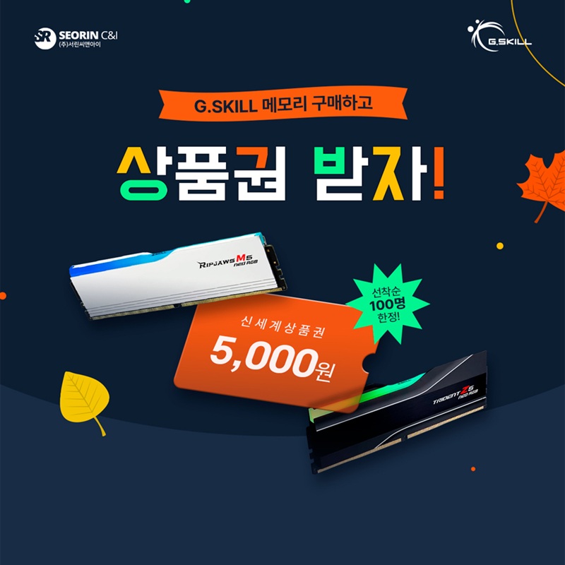 이번 이벤트는 브랜드별로 각각 운영된다. G.SKILL은 DDR4/DDR5 전 제품, KLEVV는 DDR5 RGB 전 제품, GeIL은 DDR5 전 제품이 대상이며 각 브랜드당 선착순 100명에게 혜택이 제공된다. 시스템 업그레이드 수요가 높은 성수기에 맞춰 고성능 메모리 구매 고객이 즉시 체감할 수 있는 리워드를 제공하는 것이 취지다.