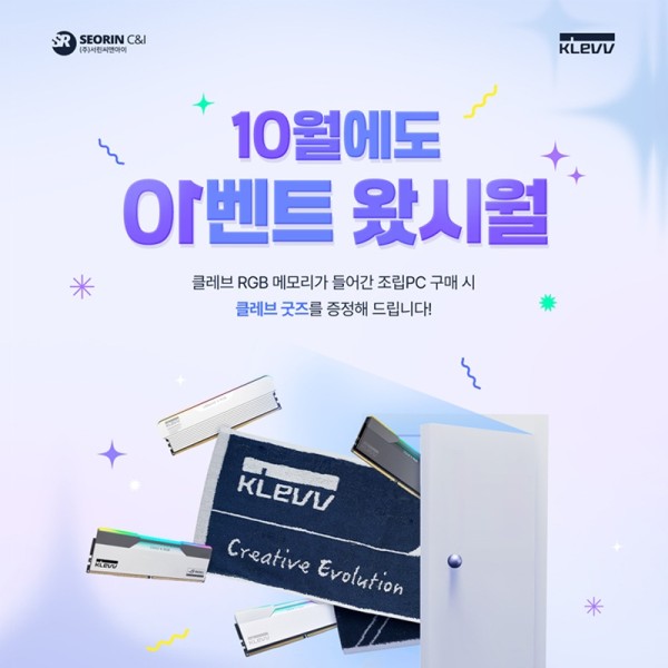 컴퓨터 관련 주요 부품 수입 유통 전문 업체 서린씨앤아이(대표: 전덕규 www.seorincni.co.kr)가 KLEVV DDR5 RGB 메모리가 포함된 조립PC 구매 고객을 대상으로 KLEVV 타올을 증정하는 10월 프로모션을 진행한다.