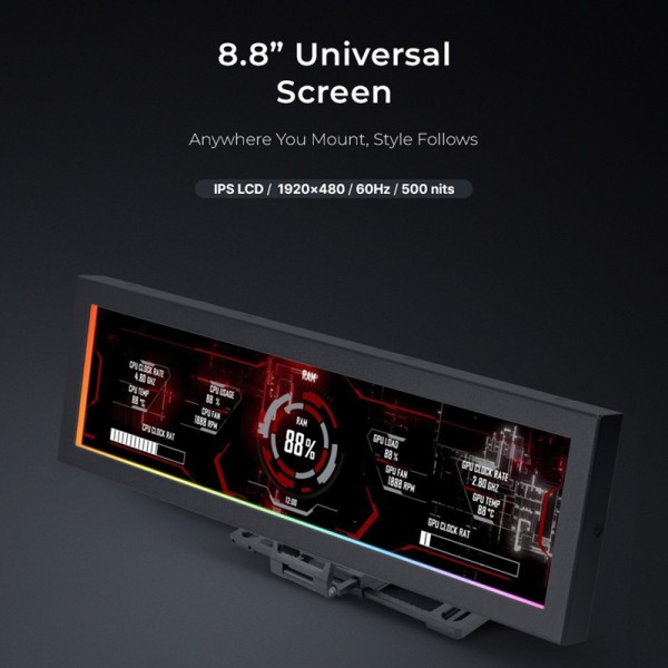 유니버설 스크린은 대부분의 PC 케이스에 간편히 장착할 수 있도록 설계된 초광폭 내부 디스플레이다. 120mm 팬 규격 홀 패턴과 호환되는 브래킷을 기본 제공해 측면 라디에이터 존이나 전면 흡기부 등 원하는 위치에 고정할 수 있으며 세로와 가로 전환 및 각도 조절을 지원해 시스템 레이아웃에 맞춘 유연한 배치가 가능하다.