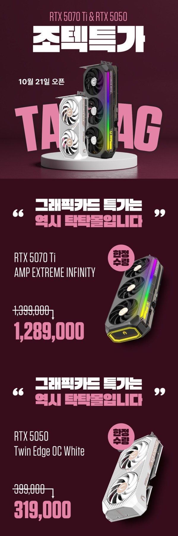 조텍의 그래픽카드 특가 이벤트는 조텍 공식 쇼핑몰 탁탁몰(www.tagtag.co.kr)에서 10월 21일 오전 11시부터 10월 23일 혹은 소진 시까지 진행된다. ‘ZOTAC GAMING GeForce RTX 5070 Ti AMP Extreme Infinity’는 1,289,000원에, ‘ZOTAC GAMING GeForce RTX 5050 Twin Edge OC White’는 319,000원에 만나볼 수 있다.
