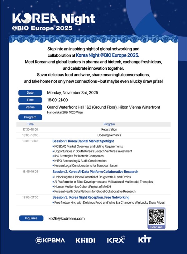 한국보건산업진흥원, 한국제약바이오협회, 한국거래소, 국가독성과학연구소가 공동으로 유럽 최대 바이오 기술 거래 장터인 ‘바이오유럽(BIO Europe) 2025’(11.3~5. 오스트리아 빈) 개막일인 11월 3일 저녁 유럽 등 전 세계 참가자들을 대상으로 ‘코리아 나잇’ 행사를 개최한다.