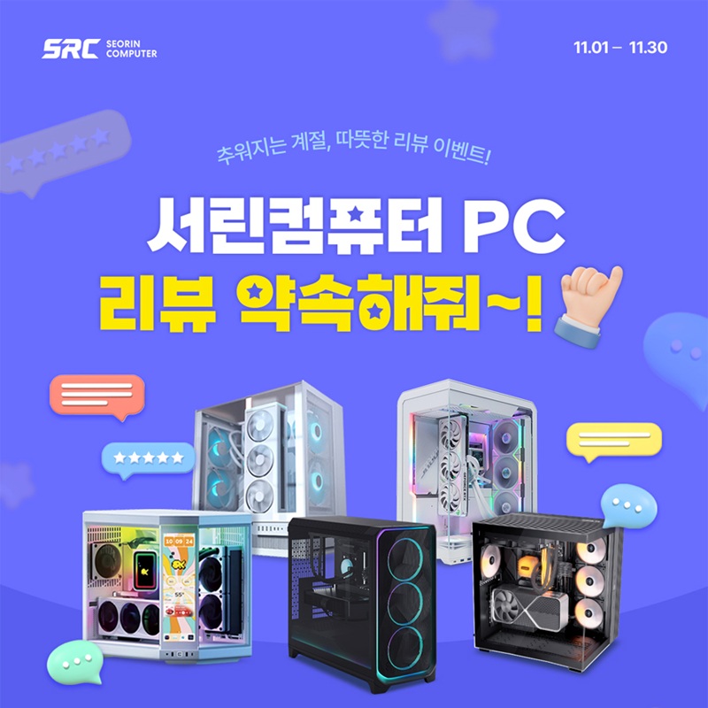 컴퓨터 관련 주요 부품 수입 유통 전문 업체 서린씨앤아이(대표: 전덕규 www.seorincni.co.kr)가 운영하는 브랜드 서린컴퓨터가 11월 한 달간 SRC PC 리뷰 약속해줘 프로모션을 진행한다. 서린컴퓨터 PC를 구매하며 리뷰 작성을 약속한 고객에게 사은품을 선지급해 PC와 함께 출고하는 것이 핵심이다. 행사 기간은 2025년 11월 1일부터 11월 30일까지다.