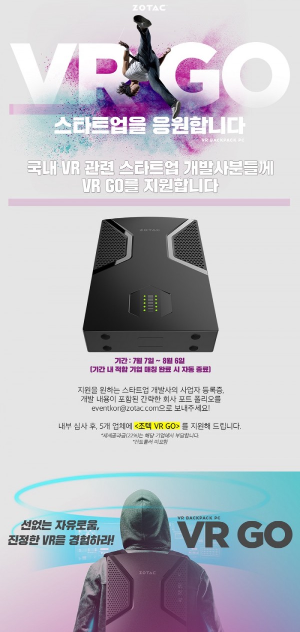 신청 방법은 참여를 원하는 기업의 사업자 등록증과 개발 내용이 포함된 간략한 회사 포트폴리오를 신청 이메일(eventkor@zotac.com)로 보내면 된다. 실시간 심사 후, 선정된 5개 업체에게 VR GO가 개발용으로 증정된다. 본 이벤트는 7월 7일부터 8월 6일까지 약 한 달 진행되며, 기간 동안 적합한 5개 업체와 매칭 완료 시 자동 종료된다.