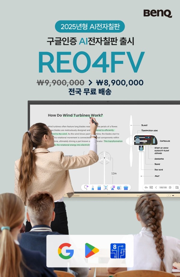 벤큐코리아 전자칠판 담당 전병열 팀장은 “RE9804FV는 AI 기반 학습 보조 기능과 대형 협업 디스플레이의 장점을 결합한 제품으로, 교육기관과 기업 모두에서 차세대 스마트 보드의 기준이 될 것”이라며 “이번 프로모션은 벤큐의 AI 전자칠판을 합리적인 가격으로 경험할 수 있는 좋은 기회가 될 것”이라고 말했다.