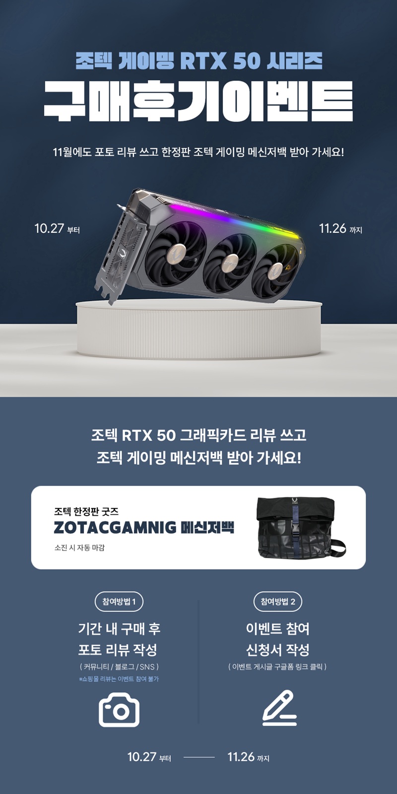 본 구매 후기 이벤트는 국내 정상 유통된 ZOTAC GAMING GeForce RTX 50 시리즈 그래픽카드 구매자 대상으로 진행되며, 제품 사진과 간단 후기를 커뮤니티, 블로그, SNS 등에 리뷰를 남겨주신 분들에 한 해 제공된다. 경품으로는 ZOTAC GAMING 메신저 백이 증정된다.