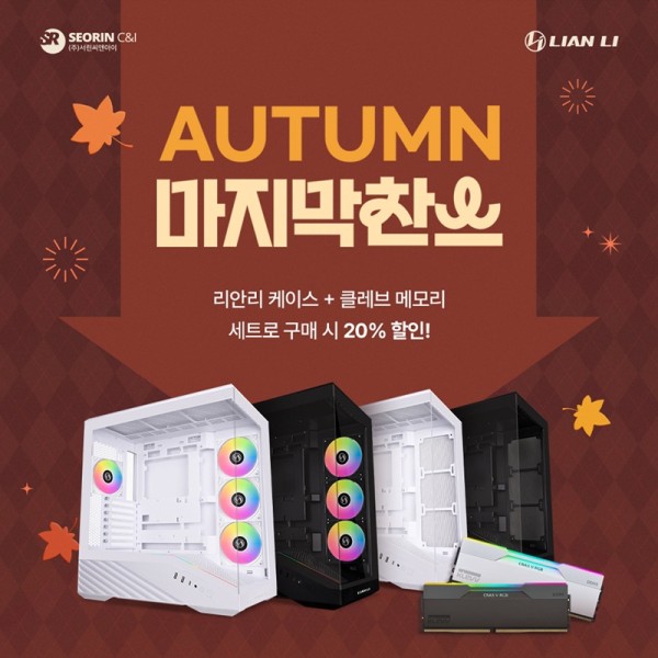 컴퓨터 관련 주요 부품 수입 유통 전문 업체 서린씨앤아이(대표: 전덕규 www.seorincni.co.kr)가 리안리(LIAN LI) 케이스 VECTOR V100과 KLEVV(에센코어) 메모리 CRAS V DDR5-6000(CL30) 32GB(16GB×2)를 세트로 구매할 경우 결제 기준 20% 할인을 제공하는 프로모션을 실시한다. 행사는 25년 1월부터 재고 소진 시까지 진행된다.